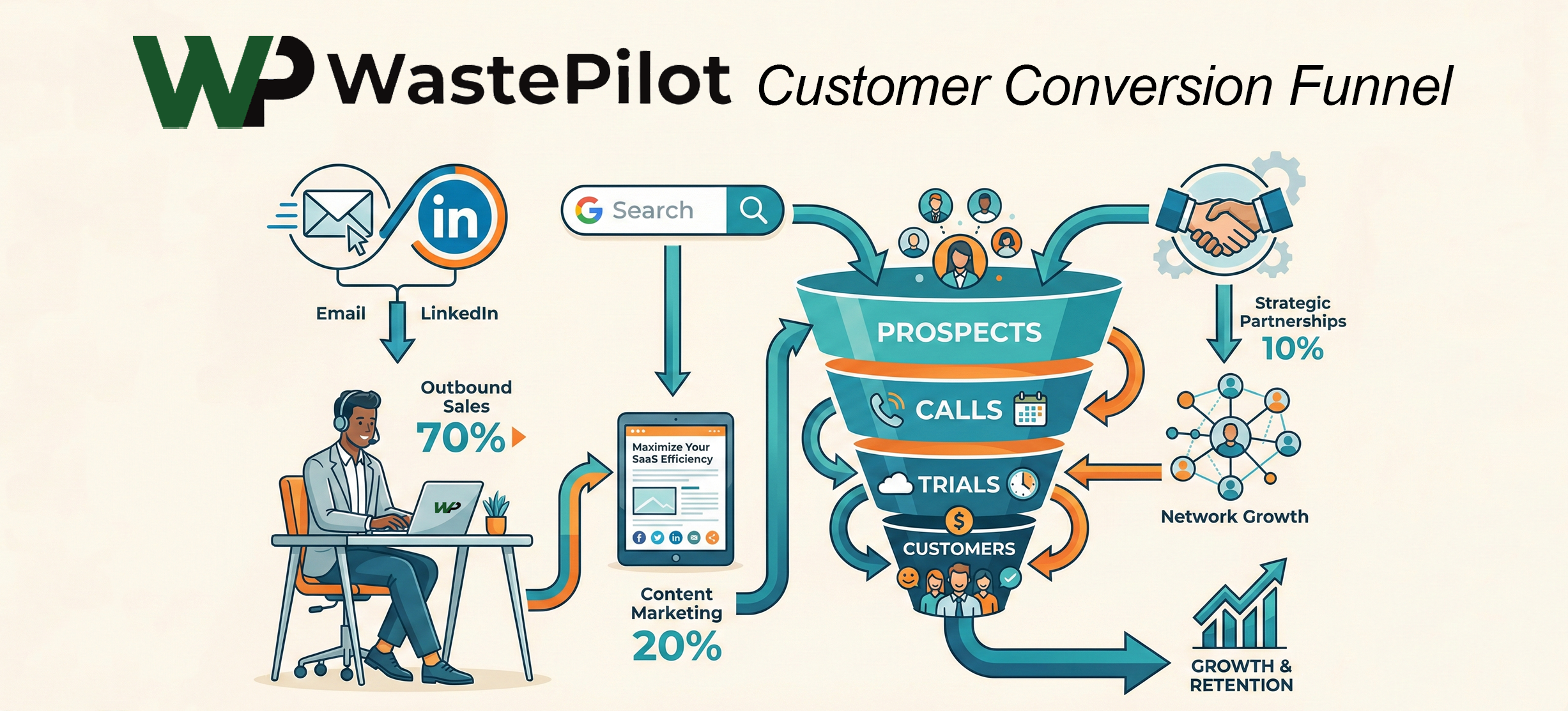 WastePilot's primary customer acquisition funnel is direct email + LinkedIn outreach. This channel gives us the fastest feedback loop, highest conversion rates, and most predictable growth. We'll supplement with organic search (long-term) and partnerships (brand-building), but email is where we'll build our foundation.